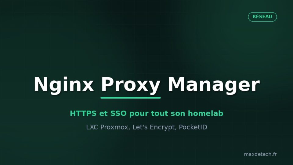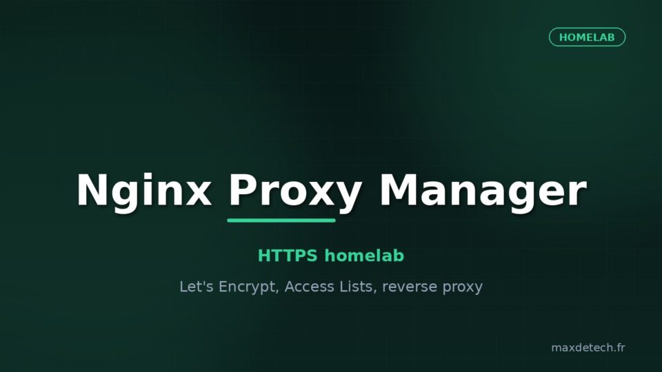 Installer Nginx Proxy Manager en Docker pour un reverse proxy HTTPS. Let’s Encrypt automatique, domaines .home, sécurité. Guide débutant.